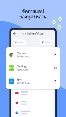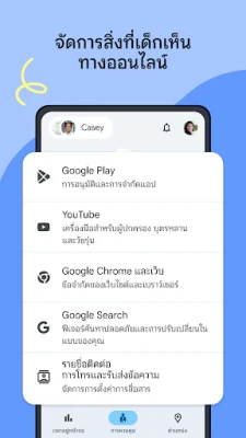 ควบคุมการใช้งานแอปและเนื้อหาออนไลน์ได้อย่างครอบคลุมด้วย Family Link ไม่ว่าจะเป็นการตั้งค่าเวลาใช้งานสำหรับแต่ละแอปที่แตกต่างกัน หรือเลือกจำกัดการเข้าถึงแอปที่อาจไม่เหมาะสม ในขณะเดียวกันก็มอบอิสระให้แอปเพื่อการศึกษาทำงานได้อย่างไม่มีสะดุด นอกจากนี้ คุณยังสามารถจัดการสิ่งที่บุตรหลานรับชมและค้นหาบนบริการยอดนิยมของ Google เช่น Chrome, Play, YouTube และ Search ตั้งค่าการบล็อกเว็บไซต์ที่ไม่ต้องการ หรือกำหนดให้ต้องขออนุมัติก่อนการติดตั้งแอปใหม่ เพื่อให้แน่ใจว่าบุตรหลานของคุณเข้าถึงแต่เนื้อหาที่เหมาะสมกับวัย